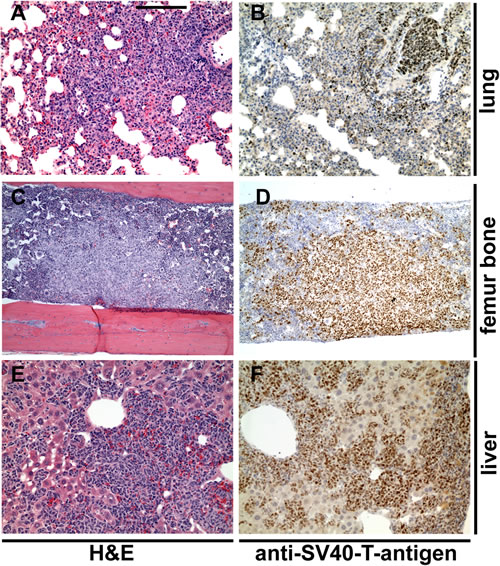 Tissue samples were processed, embedded in paraffin, and sectioned at 5µm. Sections were deparafinized, rehydrated, and processed for immunostaining with anti-SV40-Tag antibody (Millipore, DP02). The ABC MOM kit (Vector Laboratories) was used for immunohistorchemistry. Antibodies were detected using DAB peroxidase substrate kit and sections were counterstained with hematoxylin QS (both from Vector Laboratories).