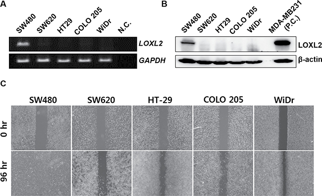Figure 1: Correlation between LOXL2 expression levels and migratory potential of different CRC cells in vitro. (A) LOXL2 expression in five CRC cell lines. Distilled water was used as a negative control (N.C.). (B) LOXL2 protein levels in CRC cells. MDA-MB-231 was used as a positive control (P.C.). (C) Motility of different CRC cells in vitro, determined in wound healing assay. Representative figures obtained in three independent experiment are shown.