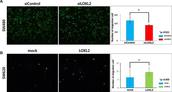 Figure 3: Effects of LOXL2 silencing/ectopic expression on the migration of CRC cells through the endothelial barrier. (A) SW480 cells transfected with siControl/siLOXL2 oligonucleotide were seeded on HUVECs, and images were obtained 36 h after seeding. (B) SW620 cells transfected with mock/LOXL2-expressing plasmids were seeded on HUVECs, and images were obtained 72 h after seeding. Results were obtained from three independent experiments and bar graphs in (A) and (B) represent cell number per image field (mean ± standard deviation).