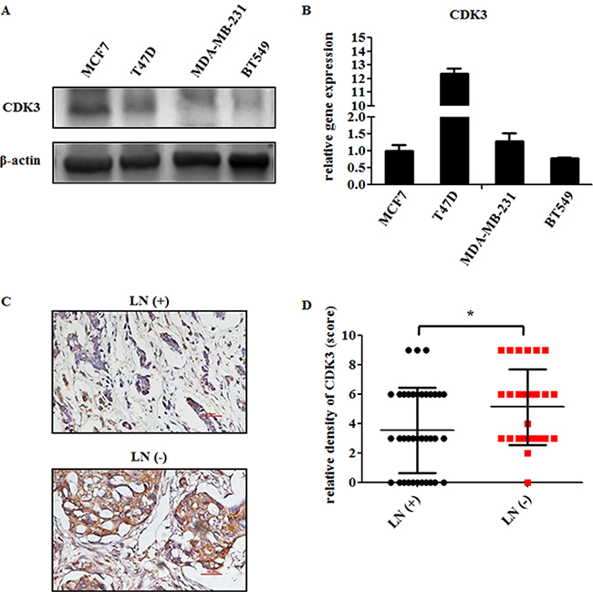 Figure 1: CDK3 is highly expressed in non-malignant breast cancer. (A) CDK3 expression was detected by western blot in both non-malignant breast cancer cell lines MCF7, T47D, and malignant breast cancer cell lines MDA-MB-231, BT549. β-Actin was used as a loading control. (B) The mRNA level of CDK3 in these cell lines was analyzed by quantitative PCR (qPCR). The relative gene expression was normalized by CDK3 level in MCF7 cells. (C) Representative immunohistochemical analysis of a breast cancer sample from a patient with lymph node metastasis [LN(+)], or without lymph node metastasis [LN(-)], labeled by CDK3 antibody (magnification, ×200). (D) CDK3 staining was evaluated and used for statistical analysis (* P < 0.05).