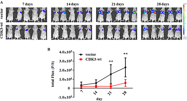 Figure 4: CDK3 inhibits breast cancer metastasis in vivo. (A) Bioluminescent images of BALB/c nude mice were measured every 7 days after i.v. injection. False color logarithmic scale represents the intensity of the bioluminescent signal in photons. (B) Quantification of the total flux of the bioluminescent signal per mouse in photons per second over the course of the experiment. Values represent the average of the total flux for all mice on the indicated day. P-values were calculated using the Mann-Whitney t-test (**P < 0.01).