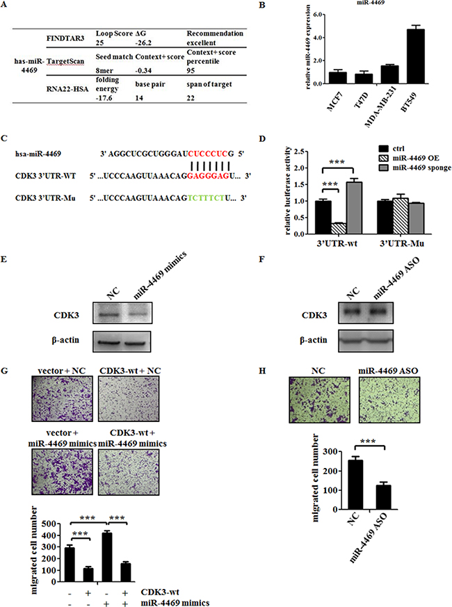 Figure 5: MiR-4469 targets CDK3 3′UTR and promotes the motility of breast cancer cell. (A) Bioinformatics prediction of the bind possibility between miR-4469 and CDK3 3′UTR. (B) Real-time PCR analysis of miR-4469 levels in MCF7, T47D, MDA-MB-231 and BT549 cells. (C) Gene structure of CDK3 showing the predicted target site of miR-4469 in its 3′UTR. (D) HEK293T cells were transfected with reporter gene containing wild-type (3′UTR-wt) or mutant CDK3 3′UTR (3′UTR-Mu) along with miR-4469 OE (overexpression) or miR-4469 sponge plasmid (***P < 0.001). (E) and (F) Western blot analysis of CDK3 protein level in MCF7 cells transfected with miR-4469 mimics or miR-4469 ASO. (G) Transwell assay was performed in MCF7 cells transfected with CDK3-wt or co-transfected with CDK3-wt and miR-4469 mimics, and quantified data was shown below. (H) Transwell assay in MCF7 cells transfected with negative controlor miR-4469 ASO, and quantified data was shown below (***P < 0.001).