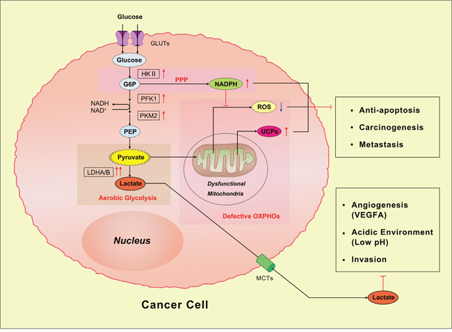 The production, transformation and utilization of energy in a living organism are essential for various biological activities. Emergences of aberrant metabolic characteristics imply a new pattern for survival and fitness or abnormal biological functions. As one of the several hallmarks of cancer [1], the anomalous characteristic of energy metabolism pathway in cancer cells has received striking attention in the past decades [2–4], which is regarded as important as other features, such as sustained angiogenesis, avoiding immune destruction and so forth [5]. In the 1920s, the metabolic distinction between normal and tumor cells was firstly reported by Otto Warburg [6], termed as ‘the Warburg effect’, which suggests even in the presence of sufficient oxygen, the malignant cells prefer to produce adenosine triphosphate (ATP) via glycolysis Instead of oxidative phosphorylations (OXPHOs) [7]. The process is also called ‘aerobic glycolysis’. As a milestone in cancer research, this remarkable discovery has become a basic principle of energy metabolism for cancer cells in the last several decades. According to ‘the Warburg effect’, the partial suppression of oxidative metabolism in tumor cells is mainly resulted from the mitochondrial dysfunction. It has long been recognized that glycolytic phenotypes in cancer cells are closely connected with defective mitochondrial OXPHOs (Figure 1). For examples, glycolytic enzymes such as lactate dehydrogenase (LDH), phosphofructokinase (PFK) and hexokinaseII(HKII) increase under hypoxic condition, which has been associated with anti-apoptosis and even ‘chemoresistance’ [8, 9]. The overproduced LDHA and LDHB catalyze the conversion of pyruvate into lactate, consequently, lactate is secreted into microenvironment through monocarboxylate transporters (MCTs), which contributes to extracellular acidity [10]. The local acidified environment can facilitate cancer invasion via an increase in vascular endothelial growth factor A (VEGFA) [11, 12]. Simultaneously, the elevated level of NADPH through pentose phosphate pathway (PPP) serves as byproducts of proliferation or cofactor for supplement of reduced glutathione (GSH) [13]. The excess NADPH not only induces the reduction of reactive oxygen species (ROS), it’s also closely linked to anti-apoptosis and initiation of metastasis under oxidative stress. The decrease of manganese superoxide dismutase (MnSOD), an important mitochondrially localized enzyme, is responsible for adaptive increase of uncoupling proteins (UCPs) and then leads to carcinogenesis and glycolytic metabolism diagram [14, 15]. Compared to OXPHOs, ‘the Warburg effect’ contributes to anti-apoptosis, increasing biosynthesis of macromolecules and balancing the intercellular redox potential [2, 4]. In addition, this original work undoubtedly provides a new avenue to oncologic research and clinical medicine, such as PET/CT, an effective diagnostic method that is widely used in many fields [16, 17]. However, increasing evidence indicates limitations and questionable points of ‘the Warburg effect’. The theory of ‘aerobic glycolysis’ was challenged by some current investigations, for example, in many human malignant cell lines, glycolysis contributes less than 50% for energy production [18]. Especially in cervical and breast cancer cell lines, such as HeLa and MCFs, mitochondrial OXPHOs still contributes 79% and 91% respectively in overall ATP generation under normal conditions, it only reduces to less than 40% in hypoxic environment [9, 19, 20]. And stunningly, Suganuma et al reported that leukemia THP-1 may be a newly identified ‘oxidative’ cell line, which is sensitive to OXPHOs inhibitor oligomycin A, inversely, it is resistant to glycolytic inhibitor 2-DG [21]. More importantly, the Warburg effect merely focuses on metabolism in cancer cell and neglected the metabolic interactions between cancer cells and other components in microenvironment [22].