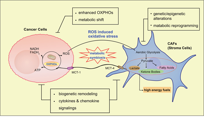 Recently, more experiments indicate that tumor-microenviroment (TME) plays a key role in carcinogenesis and epithelial-mesenchymal transition (EMT) [36, 37]. Stromal cells constituting dominantly in the microenvironment, especially the cancer-associated fibroblasts (CAFs), affect the homeostasis of TME. Futhermore, interactions between cancer cells and surrounding CAFs highly affect the growth, metabolism, metastasis and progression of carcinoma [31, 38]. Based on this renewed interest, a ‘two-compartment’ model, also named as ‘the reverse Warburg effect’, has been proposed to reconsider metabolism in tumor [39–42]. It has rapidly attracted considerable attention. In this model, cancer cells and CAFs become metabolically coupled (Figure 2). Cancer cells secrete hydrogen peroxide into microenvironment, which induces oxidative stress in neighboring CAFs. Consequently, CAFs undergo aerobic glycolysis and generate high level of energy-rich fuels (such as pyruvate, ketone bodies, fatty acids and lactate), in turn, these energy-rich fuels ‘feed’ mitochondrial OXPHOs in cancer cells and are utilized for efficient ATP production [43–46]. In this pattern, loss of Caveolin-1 (Cav-1) in stromal cells, an important structural protein that is involved in several regulations including signaling pathways, endocytosis and vesicular transport, may exacerbate oxidative stress and mitochondrial dysfunctions in CAFs [43, 47–49]. In addition, upregulated mono-carboxylate transporters (MCTs) serve as an ‘energy transfer device’, which mediates transportation of high energy fuels (such as lactate) from CAFs to cancer cells. It has been termed ‘lactate shuttle’ [31, 44, 45, 50–54].