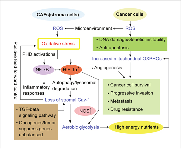 Oxidative stress is undoubtedly core part in metabolic reprogramming of two-compartment model of ‘the reverse Warburg effect’ [44, 55, 56]. It plays a critical role as a ‘mutagenic’ and ‘metabolic’ engine driving DNA damage, abnormal chromosome numbers (aneuploidy) and CAFs-cancer cell co-evolution [57, 58]. In addition, gene profiling implies that oxidative stress also affects expression of some molecules and then regulates autophagy, mitophagy, inflammatory responses, apoptosis and other behaviors in CAFs [58–60].