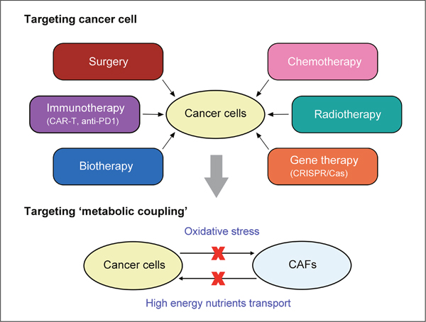 Figure 4: ‘Two-compartment blockade’ therapeutic mode based on the reverse Warburg effect. This mode targets metabolic interactions between cancer cells and CAFs, including:(1) ROS generated in cancer cells and subsequent oxidative stress on CAFs. (2) High energy metabolites transport from CAFs to cancer cells.