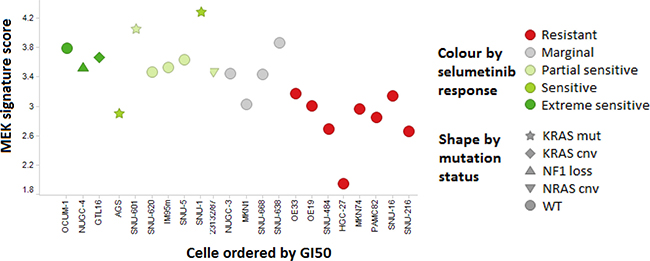Figure 1: MEK signature and sensitivity to selumetinib in a panel of GC cell lines. Cell lines sensitive to MEK inhibition (GI50 under 3 μM; partial if TGI not reached, extreme if TGI < 5 μM) consistently show higher MEK signature score that resistant (GI50 > 20 μM) cell lines, and include all cells with known MEK pathway activating genetic alterations. Few KRAS wild type cell lines (OCUM-1, SNU-620, IM95m, open circles) with high MEK signature were sensitive to selumetinib. SNU-668 cell line was categorized as KRAS wild-type in this figure (KRAS codon 61 mutation).