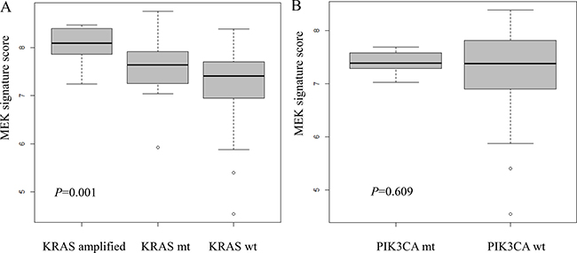Figure 3: Distribution of MEK signature in Korean cohort according to (A) KRAS mutation or amplification; (B) PIK3CA mutation status.