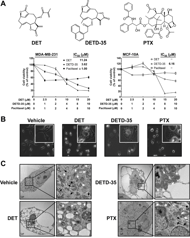 Figure 1: Effects of DET and DETD-35 on MDA-MB-231 cells. (A) Chemical structure of paclitaxel (PTX), deoxyelephantopin (DET) and its derivative DETD-35; MDA-MB-231 and MCF-10A cells were treated with the indicated concentrations of DET, DETD-35, and PTX for 24 h, and then the cell viability was examined using MTT assay. (B) MDA-MB-231 cells were treated with vehicle (0.5% DMSO), DET (11 μM), DETD-35 (3 μM), and PTX (1 μM) for 24 h, and the morphological changes of cancer cells were examined by light microscopy (×400 magnification). (C) Transmission electron microscopy (TEM) imaging (×10,000 magnification) of untreated (vehicle) and treated (DET, 11 μM; DETD-35, 3 μM; PTX, 1 μM) MDA-MB-231 cells. The ER and mitochondria (mt) are indicated by black arrowheads and white arrowheads, respectively.