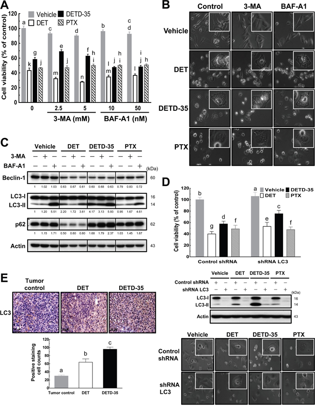 Figure 2: DET and DETD-35 induce nonautophagic cytoplasmic vacuolation death in TNBC cells. (A) Autophagy inhibitors, 3-methyladenine (3-MA) or bafilomycin A1 (BAF-A1), were co-treated with either vehicle (0.5% DMSO) or compounds (DET, 11 μM; DETD-35, 3 μM; PTX, 1 μM) for 24 h. The viability of treated MDA-MB-231 cells was determined using MTT assay. Different letters represent significant differences (one-way ANOVA, P < 0.05). (B) MDA-MB-231 cells were treated with vehicle and compounds alone, or compounds with autophagy inhibitors (2.5 mM 3-MA and 10 nM BAF-A1) for 24 h, and then the morphological changes in the treated cells were observed using light microscopy (×400 magnification). (C) Whole cell protein extracts were prepared after the various treatments described in (B), and the expression levels of three different autophagy marker proteins, beclin-1, LC3-II, and p62, were further examined by western blotting. Quantification of the corresponding protein bands was performed using Image Studio Lite software. β-actin was used as a loading control. (D) LC3 gene expression was knocked down using shRNA (shRNA LC3), and shLacZ was used as a control shRNA. The shRNA-transfected TNBC cells were treated with vehicle (0.5% DMSO), DET (11 μM), DETD-35 (3 μM), and PTX (1 μM) for 24 h, and then subjected to MTT assay and light microscopy to check the cell viability and morphological changes in treated TNBC cells. The transfected TNBC cell lysates were immunoblotted with LC3 antibodies. β-actin was used as a loading control. (E) Representative immunohistochemical images of orthotopic MDA-MB-231 tumor sections from tumor control (without treatment) and DET or DETD-35 treated NOD/SCID mice. The positive LC3 staining was visualized as a brownish color, and nuclei were stained by hematoxylin and shown in blue color. Scale bar represents 50 μm. Data are mean ± SEM, n = 3. Different letters represent significant differences (one-way ANOVA, P < 0.05).