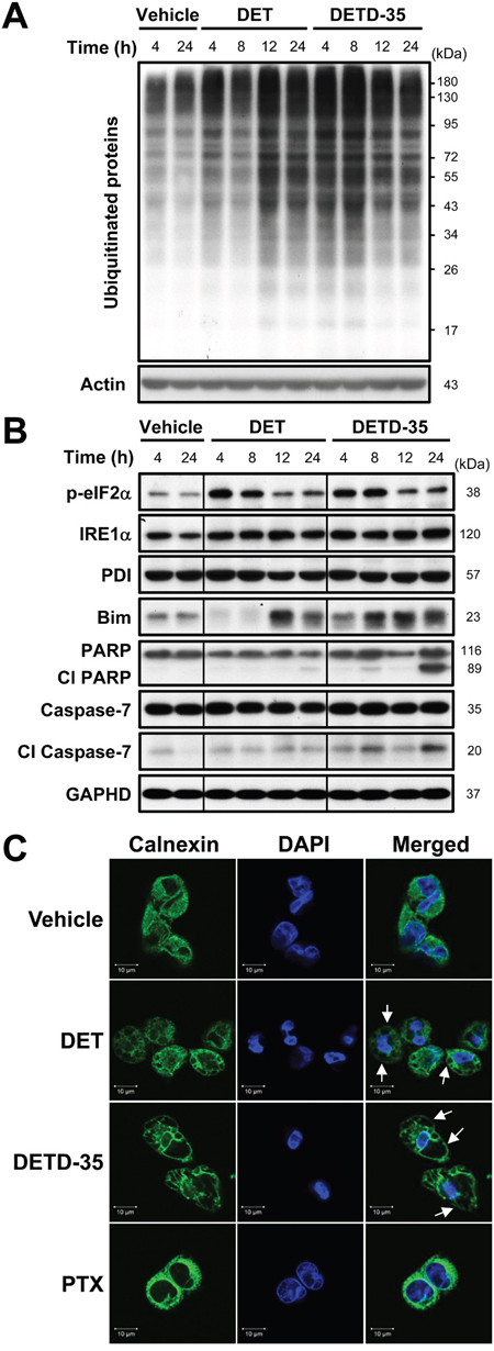 Figure 3: DET and DETD-35 significantly induce ubiquitinated protein accumulation, and ER stress and dilation in MDA-MB-231 cells. (A) Immunoblotting of ubiquitinated proteins in MDA-MB-231 cells treated with vehicle (0.5% DMSO), DET (11 μM), or DETD-35 (3 μM) for 4, 8, 12, and 24 h. The expression level of β-actin was used as a loading control. (B) The protein level of ER stress-related proteins, p-eIF2α, IRE1α, PDI, and Bim, and apoptosis-related proteins, the cleaved form of PARP and caspase-7, in vehicle or compound treated cells were determined by western blotting. GAPDH was used as a loading control. (C) Immunofluorescence analysis of MDA-MB-231 cells treated with vehicle (0.5% DMSO), DET (11 μM), DETD-35 (3 μM), or PTX (1 μM) for 24 h. The treated cells were fixed using 100% ice-cold methanol, and stained with calnexin, an ER-membrane bound protein (green), and DAPI (blue) to visualize ER structures and nuclei. White arrows indicate DET- and DETD-35-induced cytoplasmic vacuoles.