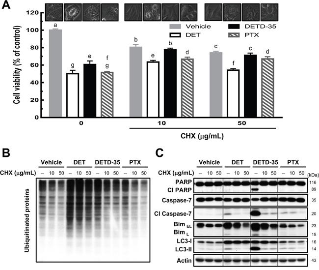 Figure 4: Pretreatment of protein synthesis inhibitor prevents DET- and DETD-35-triggered cytoplasmic vacuolation death in TNBC cells. (A) MDA-MB-231 cells were pretreated with protein synthesis inhibitor, cycloheximide (CHX 10 or 50 μg/mL), for 1 h, and subsequently treated with vehicle (0.5% DMSO), DET (11 μM), DETD-35 (3 μM), and PTX (1 μM) for 24 h. Cell viability was determined using MTT assay. Different letters represent significant differences (one-way ANOVA, P < 0.05). Phase-contrast microscopic images of the compound and/or CHX effect on vacuole formation in TNBC cells. Immunoblotting of ubiquitinated protein profile and levels (B) and the levels of apoptosis-related proteins (cleaved PARP and cleaved caspase-7), ER stress-associated protein (Bim), and autophagosomal marker protein LC3-II (C) in treated TNBC cells. β-actin was used as a loading control.