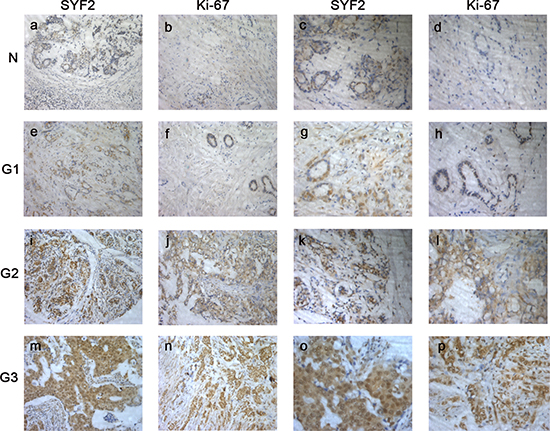 Figure 2: The paraffin-embedded BC tissues were stained with antibodies for SYF2 and Ki-67 and counterstained with hematoxylin (detailed in the “Materials and methods” section). (A–D) Immunoreactivity of SYF2 and Ki-67 in adjacent nontumorous breast tissue. (E–H). Immunoreactivity of SYF2 and Ki-67 in BC tissue of G1. (I–L) SYF2 and Ki-67 staining in cancer tissue of G2. (M–P) SYF2 and Ki-67 staining in cancer tissue of G3.a, b, e, f, i, j, m, n. Images in ×200 magnification.c, d, g, h, k, l, o, p. Images in ×400 magnification.