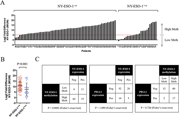 Figure 3: NY-ESO-1 promoter methylation correlated with NY-ESO-1 protein expression in lung cancer patient samples. (A) NY-ESO-1 promoter methylation in 94 human FFPE lung cancer samples, grouped into NY-ESO-1 negative and positive cohorts. (B) Significant differential methylation (P < 0.001, Student’s t-test) was observed between NY-ESO-1 positive and negative groups. Error bars represent SD. (C) NY-ESO-1 promoter hypomethylation was associated with NY-ESO-1 protein expression, while NY-ESO-1 hypermethylation was associated with lack of detectable NY-ESO-1 expression in IHC analysis. A significant association between NY-ESO-1 hypomethylation and protein expression was found, as determined by Fisher’s exact test (P < 0.0001). No associated between PD-L1 expression and NY-ESO-1 expression or methylation was observed.