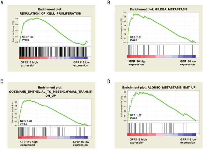 Gene set enrichment analysis (GSEA) was performed in The Cancer Genome Atlas (TCGA) datasets to acquire the biologic functions involved in CRC pathogenesis stratified by the median of GPR116 expression level. According to the enrichment plots of GSEA, the gene signatures of cell proliferation, metastasis and epithelial to mesenchymal transition (EMT) were more active in patients with higher GPR116 expression (Figure 5A-5D). Thus, we could raise hypotheses that overexpression of GPR116 may be involved in CRC progression.