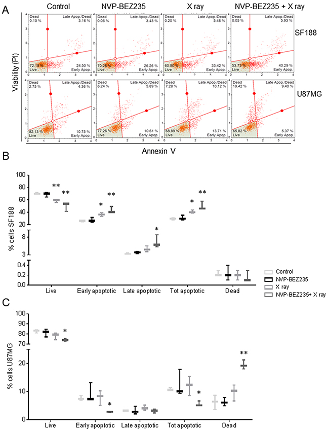 Figure 1: NVP-BEZ235 enhances cytotoxic X ray effects in SF188 and U87MG cell lines. (A) Representative dot plots showing the response of U87MG and SF188 cell lines to NVP-BEZ235 (2x GI50) and X ray (5 Gy). Annexin V staining indicates the apoptotic effect. Gates were positioned according to non-stained cells and negative controls. Percentage of live, apoptotic and dead (B) SF188 and (C) U87MG cells after treatment with NVP-BEZ235, X rays, alone or in combination (n=3, *P≤0.05, **P≤0.01, ***P≤0.001). SF188 ANOVA test: Live P =0.002; Early apoptotic P =0.0015; Late apoptotic P =0.0151; Tot apoptotic P =0.0015. U87MG ANOVA test: Live P =0.0388; Early apoptotic P =0.0296; Total apoptotic P= 0.048; Dead P= 0.0014.