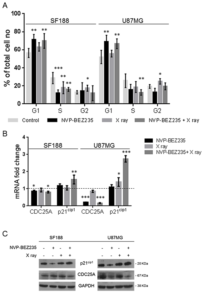 Figure 2: Effects of combination of NVP-BEZ235 and X ray on cell cycle. (A) Percentage of SF188 and U87MG cells in different phase of the cell cycle following treatment with NVP-BEZ235 and X rays, alone or in combination (n=5, *P≤0.05, **P≤0.01, ***P≤0.001). SF188 ANOVA test: G1 P =0.0017; S P= 0.0001; G2 P= 0.0472. U87MG ANOVA test: G1 P =0.001; S P= 0.0183; G2 P= 0.0038. (B) Fold change relative to controls in the levels of CDC25A and p21Cip1(CDKN1A) mRNA after treatment of SF188 and U87MG cell lines with NVP-BEZ235, X ray, alone or in combination (n=3, *P≤0.05, **P≤0.01, ***P≤0.001). SF188 ANOVA test: CDC25A P =0.0283; p21Cip1 P= 0.0018. U87MG ANOVA test: CDC25A P =0.0001; p21Cip1 P≤ 0.0001. (C) Representative immunoblots of CDC25A, p21Cip1 in SF188 and U87MG cells following treatment with NVP-BEZ235, X ray or the combination.