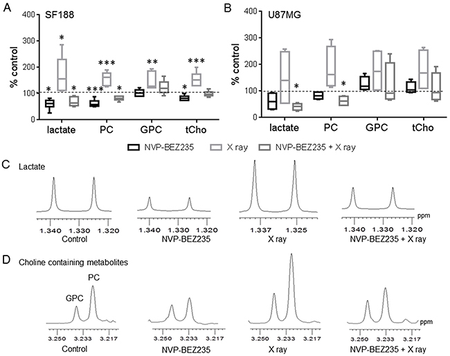 Figure 3: 1H-NMR metabolic changes after combination treatment with NVP-BEZ235 and X rays. Quantitative analysis of metabolic changes detected by 1H-NMR following 24 h treatment with NVP-BEZ235, X rays or the combination in (A) SF188 and (B) U87MG aqueous cell extracts. Data is shown as a percentage of control (n=5, *P≤0.05, **P≤0.01, ***P≤0.001). SF188 ANOVA test: lactate P =0.0008; PC P≤ 0.0001; GPC P= 0.0012; tCho P= 0.0001. U87 ANOVA test: lactate P= 0.031, PC P= 0.0018. Expansion of 1H MR spectral regions representing (C) lactate and (D) choline-containing metabolites in SF188 aqueous cell extracts.