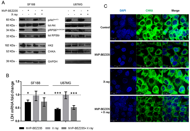 Figure 4: Alteration of enzymes involved in metabolism following treatment with NVP-BEZ235 in vitro. (A) Representative immunoblots of molecular biomarkers from the PI3K/mTOR pathway, HK2, and CHKA, in SF188 and U87MG cells following treatment with NVP-BEZ235, X ray or the combination. (B) Fold change in LDHA mRNA levels compared to the control after treatment in the SF188 cells and U87MG cells (n=3, *P≤0.05, **P≤0.01, ***P≤0.001). SF188 ANOVA test: P =0.0122; U87MG ANOVA test: P≤ 0.0001. (C) Representative immunofluorescence staining for DAPI (blue) and CHKA (green) in SF188 cells before or after treatment with NVP-BEZ235, X ray, alone or in combination (magnification 40X).
