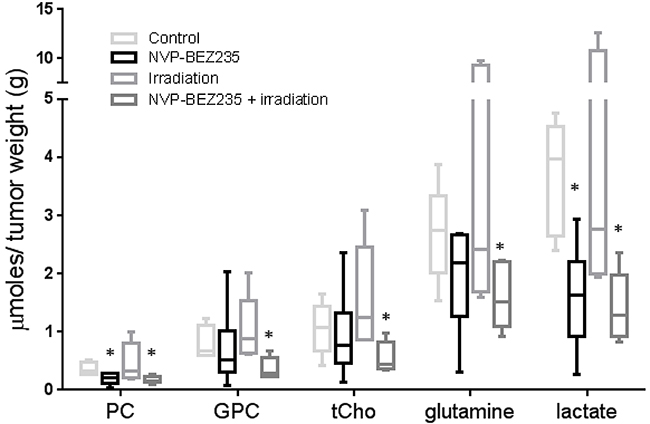 Figure 5: NMR biomarkers after NVP-BEZ235 / irradiation combination treatment in tumor extracts of an aGBM model. Quantitative analysis of metabolic changes detected by 1H-NMR following treatment of mice bearing U87MG xenografts with NVP-BEZ235, irradiation or the combination (n≥6, *P≤0.05, **P≤0.01, ***P≤0.001). ANOVA test: PC P =0.043; tCho P= 0.042; Lactate P= 0.0083.