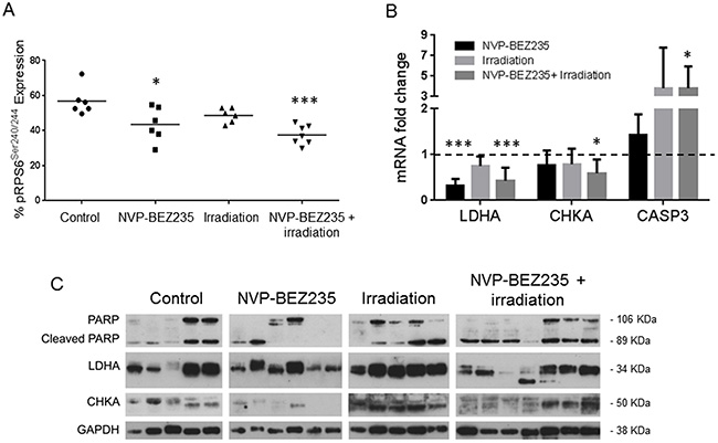 Figure 6: Enzymatic changes involved in metabolism following treatment with NVP-BEZ235 and X ray in tumor extracts of an aGBM model. (A) MSD analysis for pRPS6Ser240/244 in U87MG tumor samples after treatment with NVP-BEZ235, irradiation alone in combination (n≥6, *P≤0.05, **P≤0.01, ***P≤0.001). ANOVA test: P= 0.0008. (B) Fold change in levels of LDHA, CHKA and CASP3 mRNA after treatment with NVP-BEZ235, irradiation or in combination (n>6, *P≤0.05, **P≤0.01, ***P≤0.001). ANOVA test: LDHA P ≤ 0.0001, CHKA P= 0.048, CASP3 P= 0.043. (C) Representative immunoblots showing changes in amounts of PARP/Cleaved PARP, LDHA and CHKA in U87MG xenograft tumors following treatment with NVP-BEZ235, irradiation or the combination (each lane represents a tumor). Tumors were excised at day 8 after treatment.