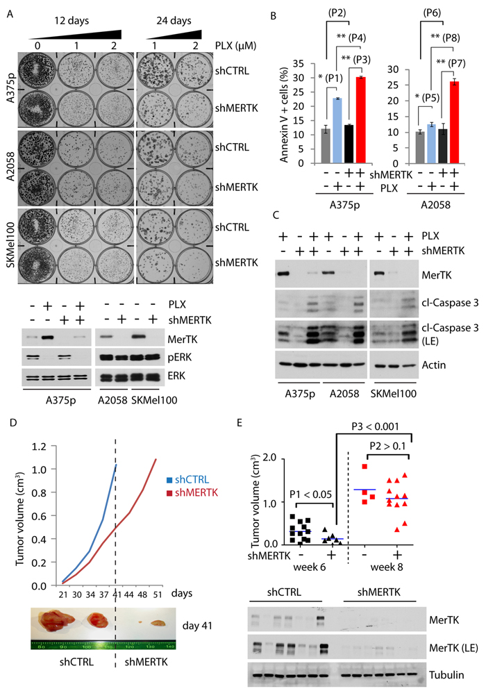 Figure 2: MerTK promotes melanoma cell survival and tumor formation. A., Endogenous MERTK was knocked down by shRNA in three melanoma cell lines (expressing BRAFV600E and different basal level of MerTK: A375p, low; A2058, medium; SKMel100, high). Optimization of shRNA was performed (Figure S2F). 500 cells per well were grown on 6-well plates incubated with vemurafenib (1 or 2 μM, equal volume of DMSO was used as control) for 12 or 24 days and stained with crystal violet. The control of MerTK depletion was shown by western blot. The size of the colony was measured with ImageJ (see also Figure S2H). Each sample was prepared in triplicates. B., FACS analysis of apoptotic potential (represented by Annexin V-positive cells) of A375p and A2058 cells with depleted MerTK in presence/absence of vemurafenib. P1 = 0.004; P2 = 0.227; P3 = 4.43E-06; P4 = 1.8E-05; P5 = 0.015; P6 = 0.482; P7 = 0.6E-03; P8 = 1.5E-04. C., A375p, A2058 and SKMel100 cells with MerTK-depletion were treated with vemurafenib (1 μM) for 3 days and the level of cleaved caspase 3 was determined. D., Growth of xenograft tumours derived from inoculated A375p melanoma cells with MERTK knockdown. 16~18 mice per group were subcutaneously injected with A375p_shCTRL or A375p_shMERTK. The tumour size was measured twice a week. The resected xenograft tumours represented the size on day 41(week 6 post-injection). E., Statistical comparison of tumour size between A375p_shCTRL (square) or A375p_shMERTK (triangle) at two time points: week 6 and week 8. Depletion of MerTK in the tumors was demonstrated by western blot. P value was calculated with GraphPad Prism.