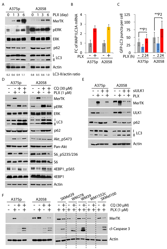 Figure 3: MerTK was stringently regulated by autophagy. A., The elevated autophagic activity following vemurafenib treatment (1 μM) was determined by increased LC3 cleavage and enhanced degradation of p62 at given time-points. Increased LC3 cleavage was determined by the ratio of LC3-II versus actin measured with ImageJ. B., Global increase of MAP1LC3A mRNA (encoding LC3) was measured by qPCR in A375p and A2058 cells treated with vemurafenib (1 μM) for 3 days. Each sample was measured in triplicates. C., GFP-LC3 puncta (representing autophagosomes) was determined in A375p and A2058 cells expressing GFP-LC3 treated with vemurafenib (1 μM) at indicated time-points. The number of GFP-labeled autophagosomes was counted under the microscope. Three independent transfection experiments were performed. P1 = 0.004; P2 = 0.0002. See also Figure S3B. D., Expression of MerTK and mTORC1 activity were investigated in melanoma cells treated with vemurafenib (1 μM, 3 days) and the pharmacological autophagy inhibitor Chloroquine (CQ, 30 μM, 3 days). Enriched LC3II fragments indicated defective lysosome-mediated degradation by CQ treatment. E., Determination of MerTK expression level in melanoma cells with transient depletion of autophagy initiating kinase ULK1 by siRNA for 3 days. F., Monitoring of apoptotic potential in 7 cell lines co-treated with PLX and CQ for 3 days. The level of cleaved caspase 3 was used to determine apoptosis.