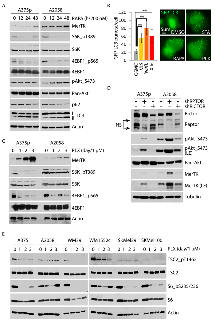 Figure 4: Vemurafenib upregulates MerTK through the mTORC1/autophagy signaling axis. A., A375p and A2058 cells were treated with 200 nM of rapamycin and the activities of mTORC1 (S6K_pT389/4EBP1_pS65) and autophagy (LC3 cleavage) were determined at the indicated time-points. B., Quantification of GFP-LC3 puncta (labeled autophagosomes) in the presence of rapamycin (200 nM), vemurafenib (1 μM), or serum starvation (STA). GFP-LC3 was transiently expressed for 3 days and the treatment was administered for 2 days. C., A375p and A2058 cells were treated with vemurafenib (1 μM) and the mTORC1 activity was determined by the phosphorylation level of its substrates S6K1 and 4EBP1 at the given time-points. D., MerTK expression was determined in A375p and A2058 with knockdown of RPTOR and RICTOR (NS, non-specific). E., Phosphorylation status of endogenous mTORC1 inhibitor TSC2 was examined in 6 melanoma cell lines treated with vemurafenib (1 μM) at indicated time-points.