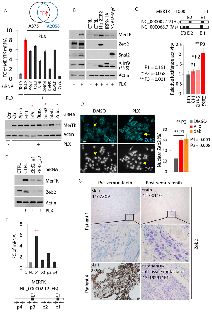 Although the precise molecular mechanism was still unknown, several studies indicated that RTK activation in response to BRAFi in melanoma was possibly a transcriptional event [9]. This was confirmed in our hands since downregulation of MerTK by inhibition of autophagy was due to decreased MERTK transcription (Supplementary Figure S5A) but not to a change of protein stability (Supplementary Figure S5B) as reported during the regulation of retinal phagocytosis [27]. To explore the molecular details how MERTK was regulated, we analyzed the transcription factors that were co-upregulated in two melanoma cell lines (A375p and A2058) treated with PLX. Based on the mRNA fold-change, the top 7 (out of 22) candidates were selected for evaluation. These 7 genes were transiently knocked down and the MERTK mRNA was measured by qPCR. When the mRNA of these 7 genes was targeted by individual siRNAs (Supplementary Figure S5C), the MERTK level was significantly affected by SNAI2 and ZEB2 depletion, but only mildly reduced with IRF9 knockdown compared to control (Figure 5A, red bar). This influence of the depletion of SNAI2 and ZEB2, rather than IRF9, was also reflected at the protein level (Figure 5A, red stars). However, unlike Zeb2, in presence of PLX, overexpression of Irf9 and Snai2 did not enhance MerTK expression (Figure 5B). Similarly, expression of Irf9 failed to increase MERTK-promoter-driven luciferase activity, which was significantly promoted with Zeb2 expression but only slightly with Snai2 expression (Figure 5C), implying that Zeb2 may be a major regulator of the MERTK promoter. Indeed, PLX-treatment induced Zeb2 accumulation in the nucleus (Figure 5D). Transient downregulation of Zeb2 with either of two distinct pairs of siRNAs effectively blocked BRAFi-induced MerTK expression (Figure 5E). The promoter region of MERTK contains a conserved E-box (E1) close to the transcription start that represents a potential binding site for E-box-binding proteins such as Zeb2. Within 1kb upstream of transcription start, there are also other E-boxes on both human and mouse promoters of MERTK. To investigate if Zeb2 can bind to these core enhancers, we performed a chromatin immunoprecipitation (ChIP) assay using overexpressed human Zeb2 in A375p melanoma cells. In the presence of PLX, Zeb2 preferentially binds to the proximal promoter region of human MERTK harbouring E-box 1 (E1), although mild binding to the E-box 2 (E2) could also be observed to a certain extent (Figure 5F). These results indicate that Zeb2 is capable of transcriptionally upregulating MERTK via direct binding to its promoter, whose activation controls MerTK expression in melanoma cells upon inhibition of mutant BRAF. In agreement with the in vitro studies, in the four paired human melanomas where MerTK is overexpressed post-vemurafenib therapy (Figure 1D), nuclear accumulation of Zeb2 is broadly present in resistant tumors (Figure 5G). However, the brain metastases from patient 8 showed equally high levels of Zeb2 before treatment compared with lymph node metastases after treatment, while MerTK was only mildly detectable (Supplementary Figure S5E). In patient 7, although MerTK was indistinguishably overexpressed in both pre- and post-vemurafenib treated tumors, the Zeb2 level was significantly higher in relapsed brain metastases after treatment (Supplementary Figure S5F). These observations suggest that except for Zeb2, MerTK is possibly regulated by other transcriptional events; vice versa, Zeb2 may transcriptionally regulate other downstream targets to confer resistance.