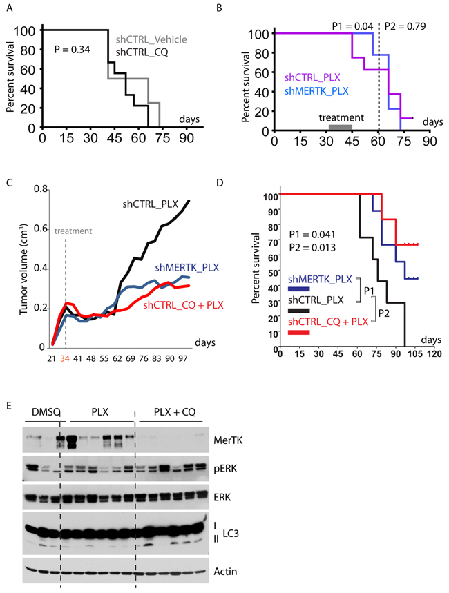 Figure 6: Combined inhibition of mutant BRAF and autophagy/MerTK overcomes resistance to vemurafenib therapy. A., Survival analysis of mice inoculated with A375p_shCTRL cells and treated with vehicle or CQ (twice a week). B., Survival analysis of nude mice inoculated with A375p_shCTRL or A375p_shMERTK cells and treated with PLX for 14 days (acute treatment). Loss of MerTK improved animal survival before day 60 (P1 = 0.04) but this effect was lost on day 80 (P2 = 0.79). C., Growth curve of xenograft tumours in mice treated with PLX, PLX+CQ and PLX+shMerTK. The treatment started on day 34 and stopped on day 97. The tumour size was measured twice a week. Each group contained 9~10 mice. D., Kaplan-Meier survival analysis of nude mice injected with A375p_shCTRL or A375p_shMERTK and treated with PLX or Combo (CQ + PLX). Daily treatment started on day 34 (when the tumour volume was between 0.15 ~ 0.3 cm3) and stopped on day 97. The mice were necropsied when the tumor volume reached ~ 1 cm3. Each group contained 8~10 mice. E., Analysis of MerTK expression in the xenograft tumours treated with PLX or combo (PLX+CQ). See also Figure 2E.