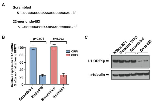 Figure 1: Endo453 sequence controls L1 expression. (A) Sequences of L1-specific endo453 and scrambled control siRNAs are shown. (B) Quantitative RT-PCR analysis of L1 ORF1 and ORF2 mRNAs after stable transfection with endo453 and scrambled control siRNAs. Each bar represents the relative expression changes between L1-active (scrambled) and L1-silenced (endo453) cells after being normalized to HPRT1 as an internal control. Fold change was calculated from 2-∆∆CT and p values by an unpaired t test. Error bars show s.d. (n=4). (C) Western blot of L1 protein in T47D cells stably transfected with endo453 and scrambled siRNAs. α-tubulin was used as a loading control. The whole cell extracts from NTera.2D1 and parental T47D cells were performed in parallel.