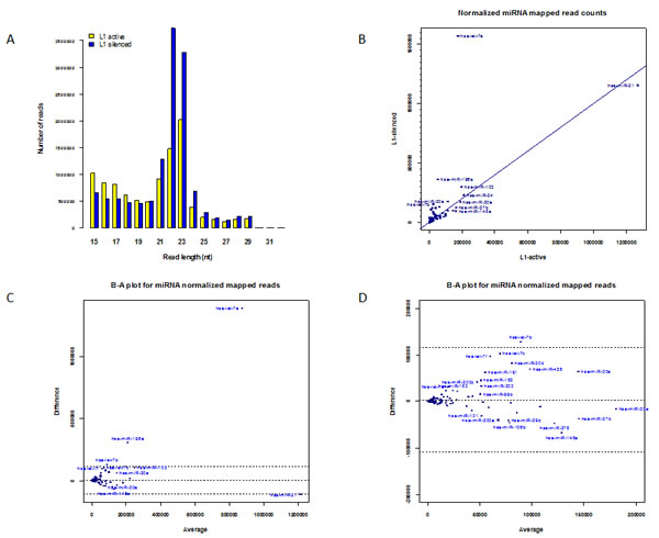The distribution of lengths of the L1-silenced small RNAs was similar to that of the L1-active library, with peaks at 22–23-nt (Figure 2A). After removal of singleton reads and reads of less than 17-nt from each library by the miRanalyzer pipeline, there were 21,266,358 and 22,745,765 reads in the L1-active and L1-silenced libraries, respectively. Surprisingly however, 8,076,212 sequence reads from the L1-silenced sample mapped to known mature miRNAs compared to 3,882,279 in the L1-active sample. This large increase in numbers of reads mapping to known miRNAs in the L1-silenced library was unexpected. However, we found that a small number of very highly differentially expressed miRNAs were responsible for most of the discrepancy (Figure 2C). In particular, in the intermediate miRanalyzer file of mapped reads at the step prior to normalization (by default named as microRNA.diffexpr in the miRanalyzer pipeline), 1,855,633 reads mapped to let-7a in the L1-silenced library compared to 149,428 reads in the L1-active library, accounting for ~41% of the difference in the unnormalized counts of the mapped sequence reads. This large difference remained even after normalizing the read counts in both libraries using the DESeq package which is incorporated into the standard miRanalyzer pipeline [32]. DESeq uses a median-based scaling method to normalize read counts rather than scaling based on the total read counts in each library. The key steps are as follows: first a reference sample is constructed by calculating the geometric mean over all samples of the counts for each mapped miRNA species. Next, for each sample, the quotient of the mapped read count of each miRNA species to that in the reference sample is calculated. The quotients for each sample are sorted in numerical order and the median quotient becomes the scaling factor for the sample. This is a robust method of normalizing read counts when a relatively few highly differentially expressed small RNA species might bias the normalization of the library sizes if a global scaling method based on total read counts in each library was used [32, 33].