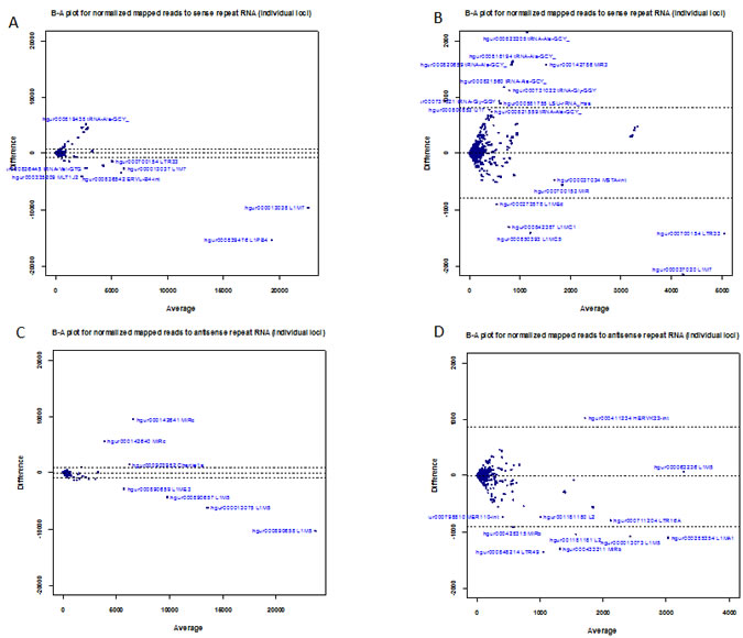Using Unix command-line tools and Perl and R scripts (available on request), we extracted the RepeatMasker [42] annotation of each mapped deepBase read (contained in the header of each read in the deepBase fasta files) and grouped the mapped reads by RepeatMasker class/family name. Read counts belonging to each class and family were summed up with R scripts to obtain the total reads belonging to each class and family of repeat element. After grouping reads into their repeat class (LINE, SINE etc), we found that for the LINE class, sense and antisense expression were very similar in the L1-active cells (ratio: 1.02, Table 1c), while in L1-silenced cells, LINE antisense expression was 24% of that of sense expression. At present, the relevance of this discrepancy is unclear but it is likely to be a result of L1 silencing. At the level of individual genomic loci (i.e., after annotating reads with their deepBase accession), we found differentially expressed sense and antisense loci. The Bland-Altman plots (Figure 4A-B) show that the sense loci most likely to be significantly down-regulated in the L1-silenced cells are hgur000839476 (belonging to the L1PB4 family) and hgur000013038 (belonging to the L1M7 family). There were also numerous differentially expressed loci with low levels of expression including repeats from the L1M7, L1MC5, L1MEd, L1MC1, LTR33 and ERVL-B4-int families (Figure 4A-B). For reads mapping to individual antisense loci, the loci most likely to be significantly down-regulated in the L1-silenced cells include hgur000890658, hgur000013075 and hgur000890657 (all belonging to L1M5) while hgur000142641 and hgur000142640 (belonging to MIRc) are up-regulated in L1-silenced cells (Figure 4C-D).