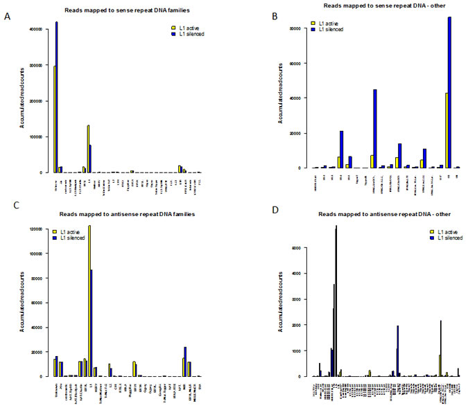 Figure 5: Mapping of sense and antisense reads to RepeatMasker families. (a) Barplot showing accumulated normalized read counts of sense repeat-associated small RNAs after mapping L1-active and L1-silenced libraries against human deepBase sense rasRNA. The mapped reads were annotated with their RepeatMasker name and grouped into their RepeatMasker families. The totals of the normalized read counts belonging to each class are shown. Colour bars: L1-active sense reads, yellow: L1-silenced sense reads, blue. (b) Barplot showing a breakdown of the sense reads in the “Unknown” group. Only reads with a total accumulated count of greater than 10 in both libraries and a fold change greater than 2 are shown. Colour bars: L1-active sense reads, yellow: L1-silenced sense reads, blue. (c) Barplot showing accumulated normalized read counts of antisense repeat-associated small RNAs after mapping L1-active and L1-silenced libraries against human deepBase antisense rasRNA. (d) Barplot showing a breakdown of the antisense reads in the “Unknown” group.