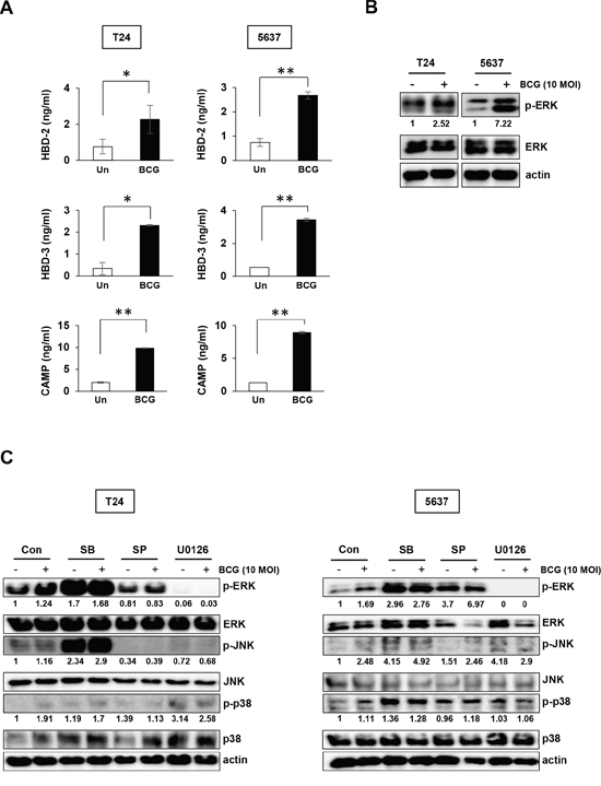 Figure 1: BCG stimulates release of antimicrobial peptides and induces ERK phosphorylation in two bladder cancer cell lines. (A) T24 and 5637 bladder cancer cells were infected with BCG (10 MOI for 8 h) or empty vector (Un; untreated), followed by ELISA of antimicrobial peptides (HBD-2, HBD-3, and CAMP) in the culture supernatant. Data are mean ± SD (n=3 per group). * P<0.05 and ** P<0.01, Student’s T-test (B) Western blotting analyses showing BCG-induced ERK phosphorylation in T24 and 5637 cells. (C) Western blotting analyses showing phosphorylation of ERK, JNK, and p38 in T24 (left panels) and 5637 (right panels) cells pre-treated with SB203580 (SB; a specific p38 inhibitor; 10 μM), SP600125 (SP; a specific JNK inhibitor; 5 μM), or U0126 (an MEK1/2 or ERK1/2-specific inhibitor; 10 μM) for 2 h, followed by BCG infection (10 MOI for 8 h). DMSO was used as control (Con). Numerical data represent phospho-ERK/total ERK and phospho-JNK/total JNK ratios determined by densitometric analyses. All expression ratios were normalized to the untreated group.