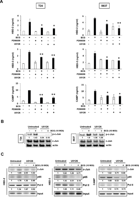 Figure 3: Inhibition of MEK pathway suppresses BCG-mediated release of AMPs in bladder cancer cells. (A) T24 (left panels) and 5637 (right panels) bladder cancer cells were pretreated with two MEK-specific inhibitors (U0126 10 μM or PD98059 1 μM for 2 h), and subsequently infected with BCG (10 MOI for 8 h). Antimicrobial peptides (HBD-2, HBD-3, and CAMP) in culture supernatants were quantified by ELISA. Data are mean ± SD of 3 independent experiments. *P<0.05 and ** P<0.01, BCG/BCG+PD98059 or BCG/BCG+U0126. Student’s T-test. (B) Western blotting analyses showing BCG-induced c-Jun phosphorylation is suppressed by MEK inhibitors in both T-24 and 5637 cells. Cells were pretreated with an MEK-specific inhibitor (U0126; 10 μM, PD98059; 1 μM) for 2 h. Subsequently, the cells were infected with BCG (10 MOI for 48 h) and cell lysates were subjected to Western blot analysis. Phospho-Jun/total Jun expression ratios were determined by densitometric analyses. Expression ratios were normalized to the untreated group. (C) Chromatin immunoprecipitation assay showing that MEK inhibition reduces BCG-mediated AMP release in bladder cancer cells. T24 cells were treated with U0126 (10 μM for 2 hours). The cells were subsequently infected with BCG (10 MOI for 8 hours) and fixed with 10% formaldehyde. The lysates were subject to ChIP assay using anti-c-Jun, -p65, and -Pol II antibodies. Expressions of AMPs were calculated as the ratio of c-Jun, p65, and Pol II to input DNA expression using densitometric analysis. All expression ratios were normalized to the untreated group.