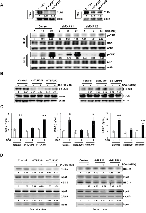 Figure 4: TLR2 participates in BCG-induced activation of MEK pathway for AMP release in bladder cancer cells. (A) Western blotting analyses demonstrating the reduction of Toll-like Receptor 2 (TLR2) or TLR4 protein expression in T24 cells transfected with two shRNA-expressing plasmids targeting TLR2 or TLR4 sequences (shTLR2#1, shTLR2#2, shTLR4#1 and shTLR4#2, respectively; upper panels). Non-specific scrambled shRNA was used as control. shRNA TLR2 or TLR4 knockdown cells were selected with puromycin, and infected with BCG (10 or 30 MOI for 48 h; lower panels). Phospho ERK expression was detected by Western blotting. (B) Stable clones of TLR2- or TLR4-knockdown T24 cells were treated with BCG (10 MOI for 8 h) and analyzed for expression of phosphorylated c-Jun. Phospho-Jun/total Jun expression ratios were calculated by densitometric analysis, and indicated under each lane. Expression ratios were normalized to the untreated group. (C) StableshTLR2 or shTLR4 T24 bladder cancer cells were infected with BCG (10 MOI for 8 h), followed by ELISA of antimicrobial peptides (HBD-2, HBD-3, and CAMP) in the culture supernatant. Data are mean ± SD (n=3 per group). * P<0.05 and ** P<0.01 Student’s T-test. (D) ChIP assays using anti-c-Jun antibody to detect physical interactions between c-Jun and HBD2, HBD-3 or CAMP. TLR2-or TLR4-knockdown T24 cells were infected with BCG (10 MOI for 8 h) and cross-linked with 10% formaldehyde. Expressions of AMPs were calculated as the ratio of c-Jun to Input DNA expression using densitometric analysis. All expression ratios were normalized to the untreated group.