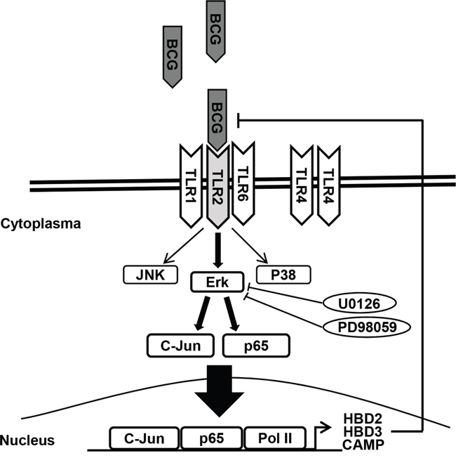 Figure 6: Schematic diagram of the working hypothesis. BCG induces ERK phosphorylation via TLR 2, leading to c-Jun- and p65-dependent transcription of HBD2, HBD3, and CAMP. Pharmacological inhibition of ERK phosphorylation and/or genetic ablation of TLR2 enhance the anti-proliferative effects of BCG on bladder cancer cells.