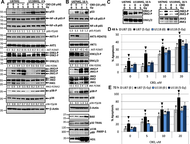 Figure 1: Changes in cell signaling proteins and induction of apoptosis in U87MG and U118MG glioblastoma cells following treatment with γ-irradiation and CBD, alone or in combination. (A, B, C) Western blot analysis of cell signaling proteins 4 h and 16 h after combined treatment of U87MG and U118MG cells with CBD (10 μM) and γ-irradiation (5 Gy). CBD was diluted in DMSO; 0.1% DMSO served as a vehicle; CBD and DMSO were added to the cell cultures 30 min before irradiation. (D, E) Cell cycle-apoptosis analysis of U87MG and U118MG cells 48 and 72 h after combined treatment with increased concentrations of CBD and γ-radiation (5 Gy). CBD (diluted in DMSO) was added 30 min before irradiation. Control cells (CBD, 0) were treated with 0.1% DMSO 48–72 h after treatment; then cell nuclei were stained with PI and DNA content was determined using the flow cytometry. Apoptotic cells and secondary necrotic cells (originated from apoptotic cells) were in the pre-G1 region. Pooled results of four independent experiments of dose-dependent effects of CBD and irradiation (5 Gy) for U87MG and U118MG cells are shown. Error bars represent means ± S.D. (p < 0.05, Student’s t-test). Stars indicate significant differences in apoptotic levels between non-irradiated and irradiated U87MG cells; arrows indicated significant differences between irradiated U87MG cells pending CBD concentration; circles indicate significant differences in apoptosis between non-irradiated U118MG cells in the presence of CBD.