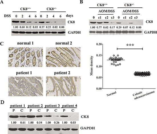 Figure 1: CK8 is down regulated in colitis and colitis-associated colorectal cancer. (A) CK8+/+ mice and CK8+/– mice were fed with 5% DSS-containing drinking water for 5 consecutive days and followed by regular water for 1 day. The colonic expression of CK8 were investigated using Western blotting analysis. The blots bands were scanned for densitometry analysis with the value obtained from CK8+/+ mice without DSS treatment set as 1. (B) Colitis- associated colorectal cancer was induced in CK8+/+ mice and CK8+/− mice with AOM/DSS treatment as Material and Methods described. The colonic expression of CK8 were investigated using Western blotting analysis. The blots bands were scanned for densitometry analysis with the value obtained from CK8+/+ mice without AOM/DSS treatment set as 1. (C) The expression level of CK8 in human specimens of normal (n = 26) and neoplastic colon (n = 76) using immunohistochemical analysis with a specific antibody to the CK8 protein. The Mean density of CK8 positive cells in each sample was quantified by Image Pro-plus 6.0. ***P < 0.001.(D) The colonic expression of CK8 in four colon cancer patients were investigated using Western blotting analysis(P: para-cancer tissues, C:cancer tissues). The blots bands were scanned for densitometry analysis with the value obtained from colon cancer patients’ para-cancer tissues set as 1.