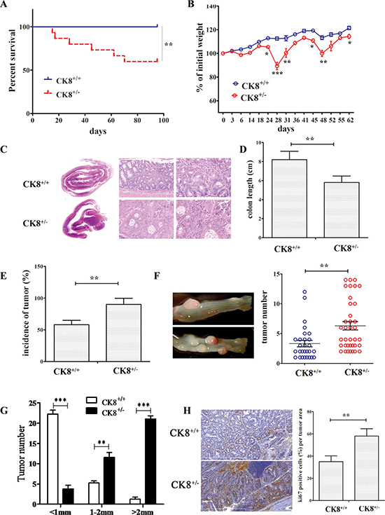 Figure 2: Knockdown of CK8 promotes susceptibility to AOM/DSS-induced colitis-associated colorectal carcinoma. (A) CK8+/+ mice and CK8+/− mice were treated with AOM/DSS as Material and Methods described. Their survival was monitored until day 96 after treatment with AOM. Survival Differences were evaluated with the Mantel-Cox test. **P < 0.01. (B) The mean changes in body weight of the CK8+/+ and CK8+/− mice were measured at the indicated time until day 62. At the end of 2nd cycle DSS on day 45 full length of the colon was prepared in a Swiss roll method and subject to H&E staining (C). The colon length was measured (D). At the time of harvest after 3rd DSS cycle, incidence of macroscopic polyps was analyzed (E). (F) Tumors within the colon were counted with the assistance of stereomicroscopy. (G) Measurement of largest dimension of tumor (mm) was performed using calipers. (H) Ki-67 immunohistochemistry staining (left panel) and percentage of Ki-67 positive cells. Data are shown as the mean ± s.d and are representative of three independent experiments. *P < 0.05, **P < 0.01, ***P < 0.001.