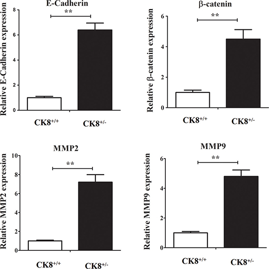 Figure 3: Cancer-related genes mRNA expression in colons of CK8+/+ mice and CK8+/− mice with colorectal cancer. CK8+/+ mice and CK8+/− mice were treated with AOM/DSS as the above described and then RNA was extracted for real-time PCR analysis. Data are shown as the mean ± s.d and are representative of five individuals. **P < 0.01.