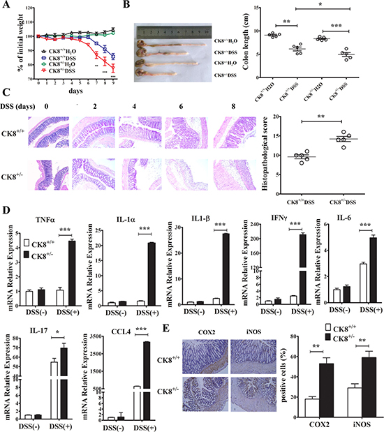Figure 4: CK8 dampens inflammatory responses after DSS induction. (A) The mean changes in body weight of the CK8+/+ and CK8+/− mice (n = 10 for each genotype) after being fed with 5% DSS were measured every day until day 9. Colon length were measured (B). Histological changes in the colon tissue were examined by H&E staining (C). Inflammation score of colon tissue was performed as described in materials and methods. (D) The levels of the indicated genes in colons from CK8+/+ or CK8+/− mice were quantified by real-time PCR analysis (n = 3 for each group). (E) The levels of COX2 and iNOS in colon tissue (n = 5 for each group) mice were measured using immunohistochemistry staining. Data are shown as the mean ± s.d. *P < 0.05, **P < 0.01, ***P < 0.001.