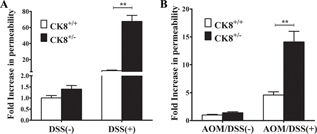 Figure 6: CK8+/− mice exhibit increased colonic permeability during DSS-induced colitis and AOM/DSS-induced colorectal carcinogenesis. (A) CK8+/+ mice and CK8+/− mice were treated with 5% DSS as above described and on day 7 FITC-dextran permeability assay was performed (n = 4 for each group). (B) CK8+/+ mice and CK8+/− mice were treated with AOM/DSS as above described and on day 60 at the end of 3rd DSS cycle FITC-dextran permeability assay was performed (n = 4 for each group). Data are shown as the mean ± s.d. **P < 0.01.