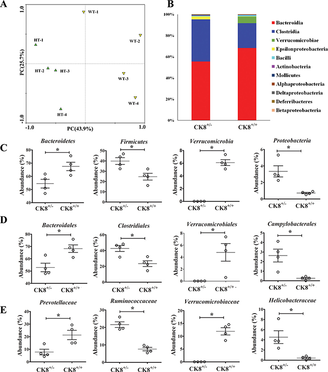 Figure 7: Fecal microbiota of CK8+/− mice is distinguished from that of WT mice after AOM/DSS treatment. The age-matched (8 weeks) and sex-matched CK8+/− and littermate WT mice were treated with AOM/DSS as described above, then at the end of the 3rd DSS cycle, fecal samples were harvested. The 16S ribosomal RNA gene in the fecal samples was sequenced. (A) Principal coordinates analysis (PCA) scores plot based on the relative abundance of OTUs (97% similarity level). (B) Histogram represents the relative abundance of bacterial class in each group (n = 4 for each group). The abundance of major bacteria at the phylum (C), order (D), and family (E) was analyzed. Each dot represents an individual microbiota sample from the mice. Horizontal bars indicate mean values. *P < 0.05, Mann-Whitney U test. n = 4 per group.