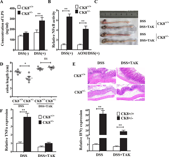 Figure 9: TLR4 inhibitor treatment reduced the susceptibility of CK8+/− mice to DSS-induced colitis. CK8+/− and CK8+/+ mice were treated with DSS as above described. The serum lipopolysaccharide (LPS) level was investigated (A). (B) NF-κB activity in colonic tissue from DSS or AOM/DSS treated CK8+/− and CK8+/+ mice were measured.(C) TAK-242 were administered intravenously at the dose of 1mg/kg to CK8+/− and CK8+/+ mice. Then the mice were fed 5% DSS-solution in drinking water for 5 days, followed by regular drinking water for 3 days. The severity of colitis was evaluated with colon length (D), histological injury (E), and expression levels of inflammatory cytokines (F). Data are shown as the mean ± s.d. *P < 0.05, **P < 0.01. n = 5 for each group.