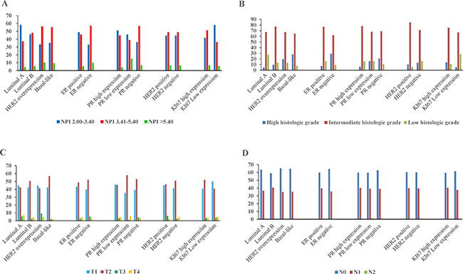 The distribution percentages of NPI scores and its components in the molecular subtypes are shown in Table 2 and Figure 1. The percentages were luminal A > luminal B > HER2 overexpression or basal-like in the NPI 2.00–3.40 group, whereas, the percentages were luminal A < luminal B < HER2 overexpression or basal-like in the NPI > 5.40 group. The percentages were luminal A < luminal B < HER2 overexpression < basal-like in the high histological grade group, whereas, the percentages were luminal A > luminal B > HER2 overexpression > basal-like in the low histological grade group. The differences of the histological grade in the four molecular subtypes were statistically significant (P < 0.001). However, there are no significant differences of tumor size or lymph nodes in the four molecular subtypes. Luminal B subtype included HER2 negative and HER2 positive subgroups, and there was no difference of NPI score between two subgroups (P = 0.305). However, the difference of NPI score between HER2+/ER+ and HER2+/ER- subtypes was statistically significant (P = 0.038).