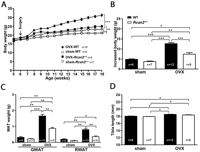 Figure 2: Changes in body weight and adipose tissue deposition in WT and Rcan2−/− mice after sham-operation or bilateral ovariectomy fed on a NCD. (A) Growth curves of sham-operated (sham) females and ovariectomized (OVX) females fed NCD. Arrows show the time of sham-operation or ovariectomy. (B) Increased body weight measured from postnatal week 6 to week 18. (C) Mean weights of gonadal (GWAT) and retroperitoneal white adipose tissue (RWAT) and (D) mean tibia lengths in females at postnatal week 18. The number of mice (n) used in the experiments was indicated directly in each panel of figures. Statistics were performed using one-way ANOVA, and individual group differences presented here were measured using Bonferroni correction. *: p <0.05, **: p <0.01, ***: p <0.001. All values are given as means ± SEM.
