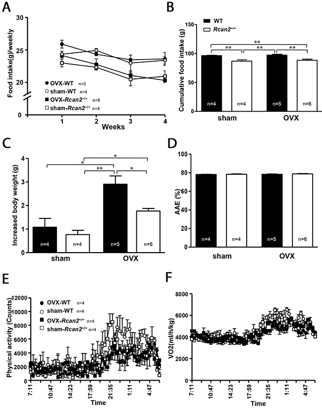 One week after the surgery, four mice of the same genotypes were housed in individual cages. Pair-feeding was accomplished by measuring the food intake of the ad libitum-fed sham Rcan2−/− female mice every 24 hours and providing the same amount of food to pair-fed sham WT mice or OVX mice (both Rcan2−/− mice and WT mice). Body weight was recorded every week. After 11 weeks of pair-feeding experiments, mice were anesthetized and fat pads and livers were removed and weighed using a digital electronic balance.