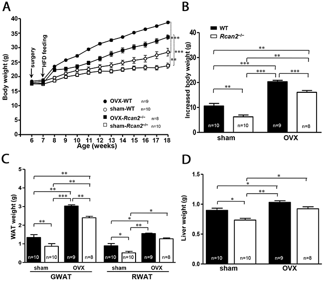 Figure 5:Changes in body and adipose tissue weights of WT and Rcan2−/− mice after sham-operation or bilateral ovariectomy fed on a HFD. (A) Growth curves of sham-operated (sham) females and ovariectomized (OVX) females fed HFD. Arrows indicate the time of sham (or OVX) operation and the start point of high-fat feeding. (B) Increased body weight measured from postnatal week 6 to week 18. Mean weights of gonadal (GWAT) and retroperitoneal white adipose tissue (RWAT) (C) and liver (D) in females at postnatal week 18. The number of mice (n) used in the experiments was indicated directly in each panel of figures. Statistics were performed using one-way ANOVA, and individual group differences presented here were measured using Bonferroni’s correction. *: p <0.05, **: p <0.01, ***: p <0.001. All values are given as means ± SEM.
